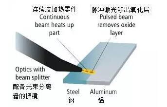 鋁材和鋼材不能使用常規方法進行焊接。然而,用激光技術能夠實現固態搭接。激光在光束的焦點熔化鋼材,然后熔化物加熱在它下面的鋁材。當它固化時,鋼材與鋁材之間形成一層類似于釬焊效果的連接。